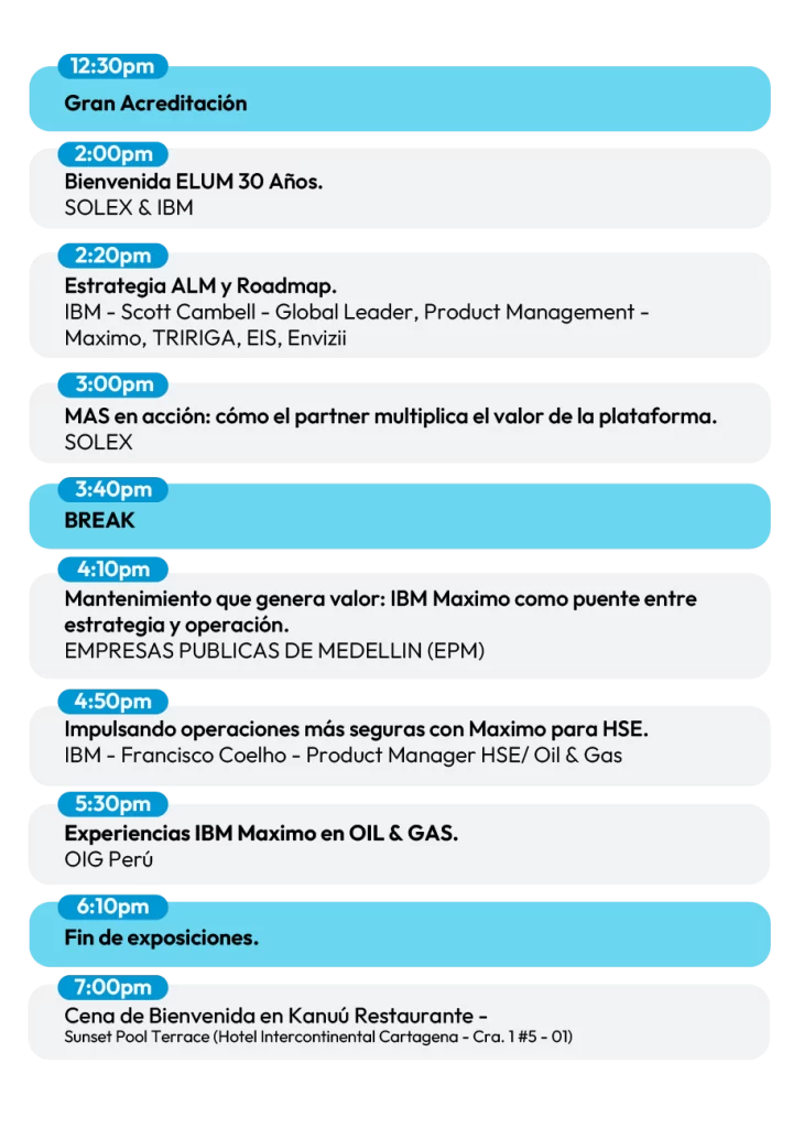 Gracias a esas alianzas y al espíritu colaborativo que siempre ha caracterizado a Solex, el crecimiento fue inevitable. Hoy, Cartagena – Colombia se ha convertido en el epicentro de esta gran comunidad latinoamericana, siendo la sede oficial del ELUM, el encuentro que reúne a los usuarios de IBM Maximo de toda la región.